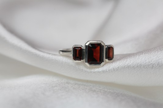 Emerald Cut Garnet Three Stone Ring